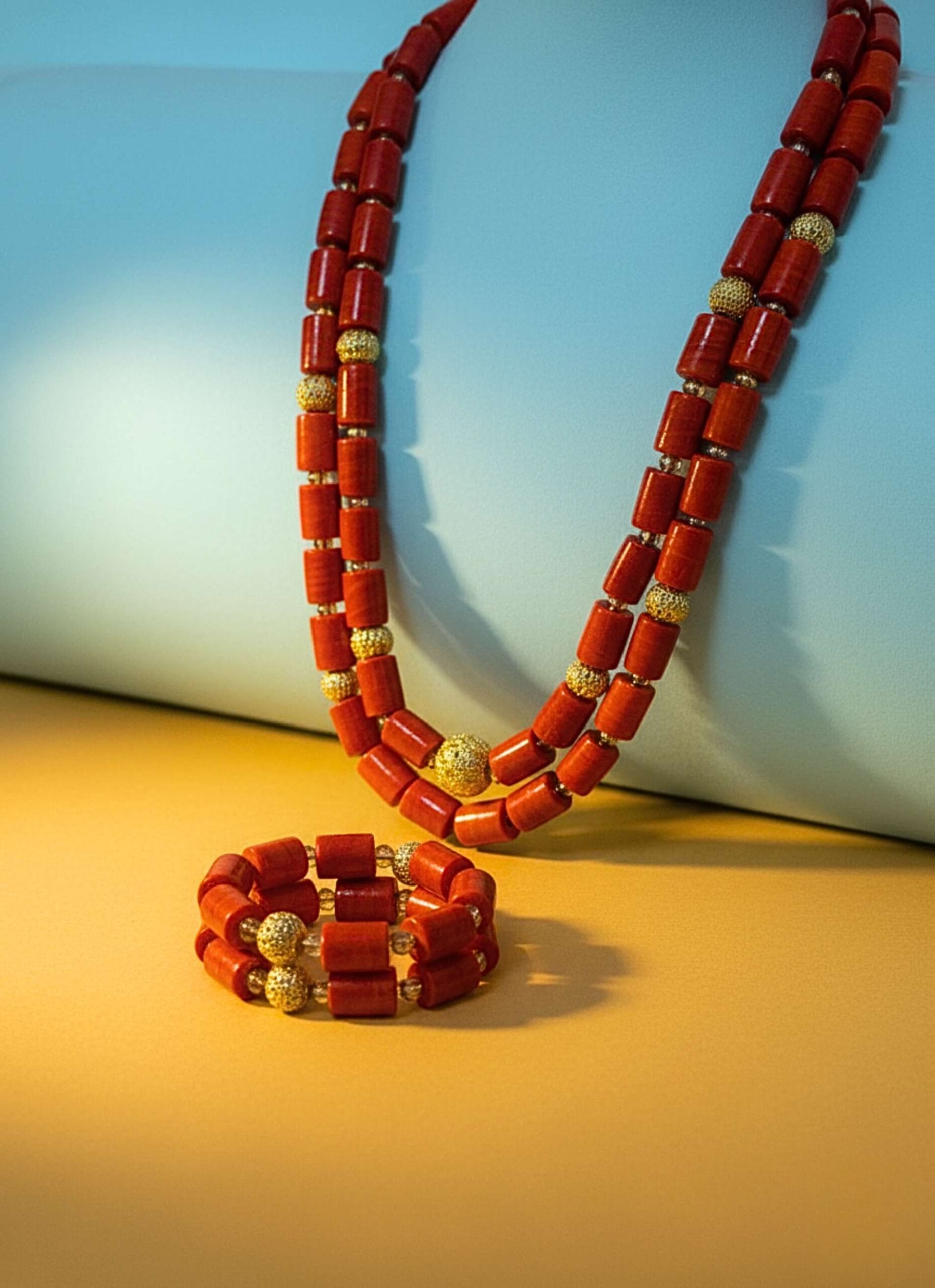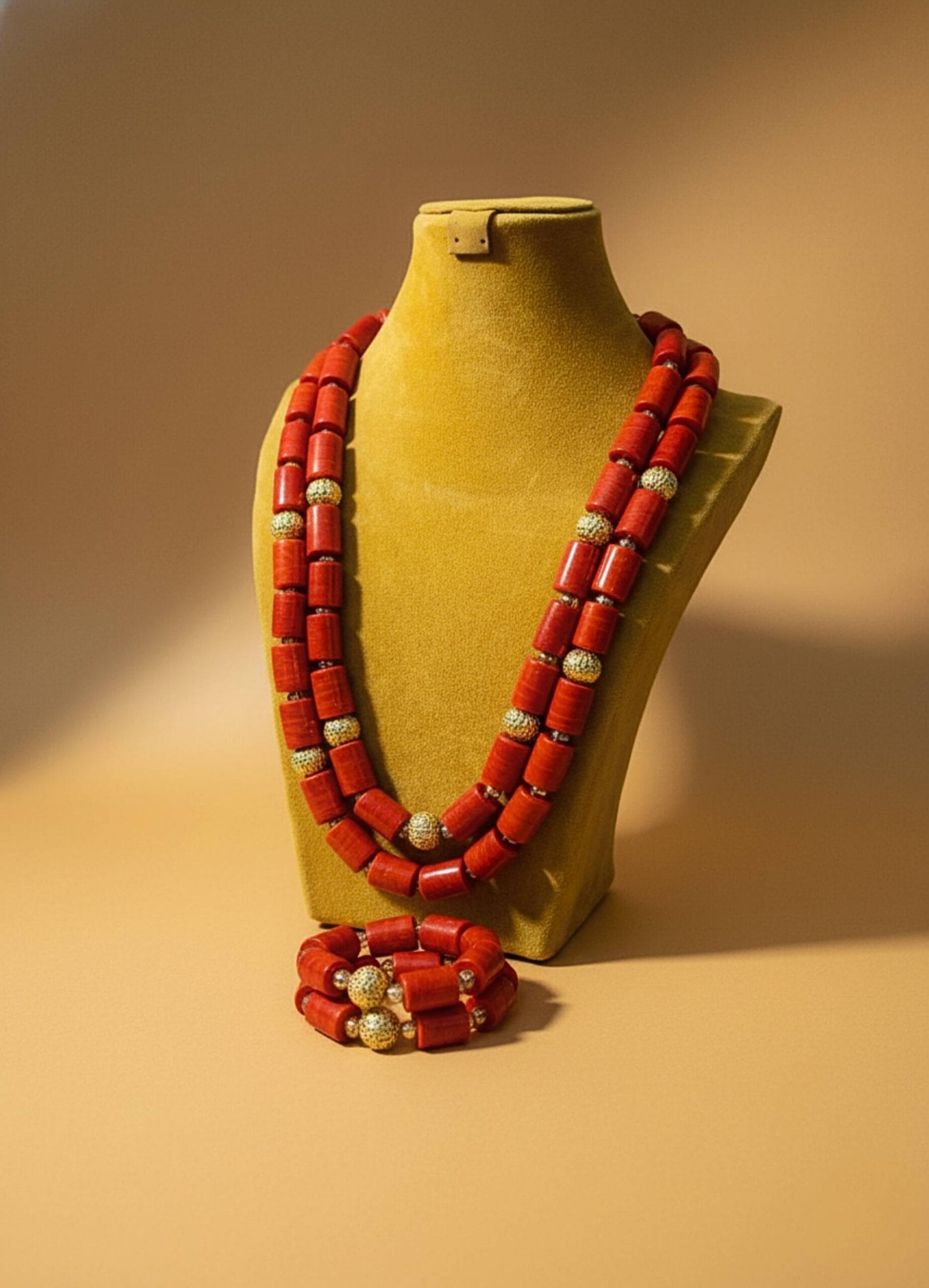 African Coral Beads for Men – Traditional Igbo Wedding Bead Set (Red Coral Necklace)