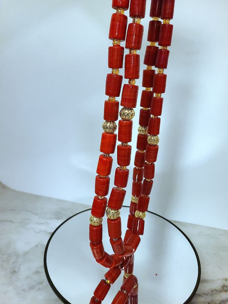 Perfect for Igbo traditional weddings, chieftaincy ceremonies, cultural festivals, and royal occasions, this bold red coral bead necklace instantly transforms your outfit into a statement of power and heritage.